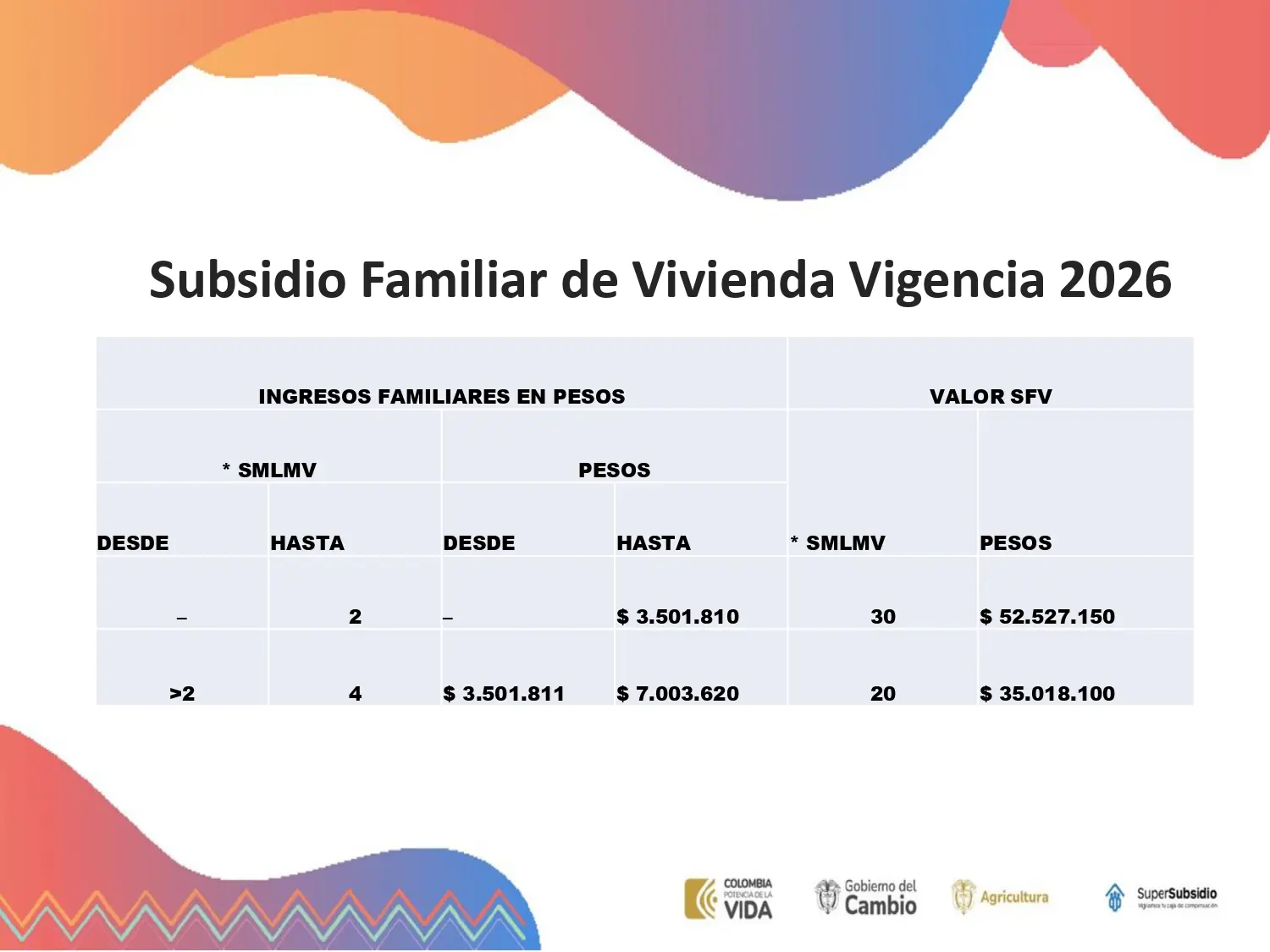 Ingresos familiares en pesos Valores SFV